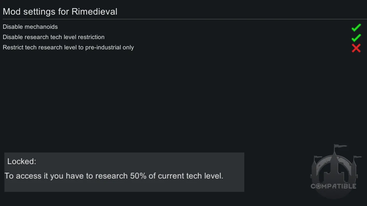 Instead of removing technologies and things, mod patches each pawn and faction, hiding technologies higher than the medieval ones. Now every faction have it`s own marker with current tech level in the description. And even more! We've patched all the quest rewards, which Medieval - Vanilla didn't.
