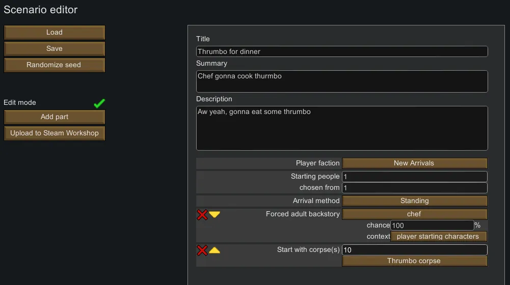 Choosing the Forced implant option allows you to add implants or upgrades. Force all of your starting pawns to have archotech eyes. Force all non-player pawns to have the Ballet Dancer backstory and have peg legs. Force all birds to have bionic hearts. Go wild. I haven't locked this down; you'll have the option to apply an upgrade to any body part. I'd recommend not adding bionic arms to the brain slot; it won't do what you want it to do and will just generally be silly.