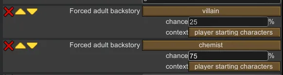 Can specify multiple backstories with a max total chance of 100% per slot. If there's a 25% chance of one childhood backstory for the starting player and 75% of another childhood backstory also for the starting player, the starting pawns will only be assigned one of those two childhood backstories at those possibilities. If there's a 50% chance of an adult backstory and the remaining 50% is unassigned, the starting pawns will have a 50% chance of having that backstory and 50% of falling back to using the standard Rimworld backstory assigner.