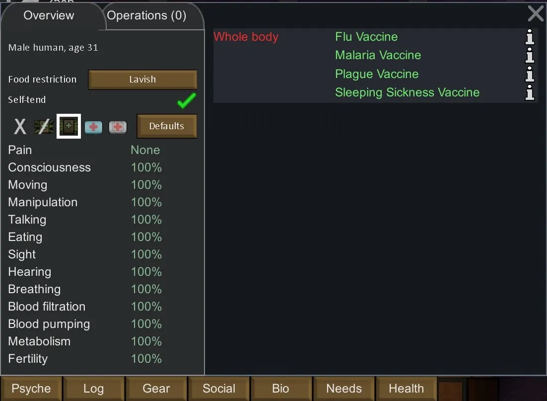 The vaccines are probably OP for the game but vaccines are kind of OP in real life. The plague, malaria and sleeping sickness vaccines are all effective for about 20 years. The flu vaccine is effective for about one year. I tried to make the requirements for making the vaccines high to somewhat counter the OP-ness of them. They also must be kept frozen or they will spoil in one day.