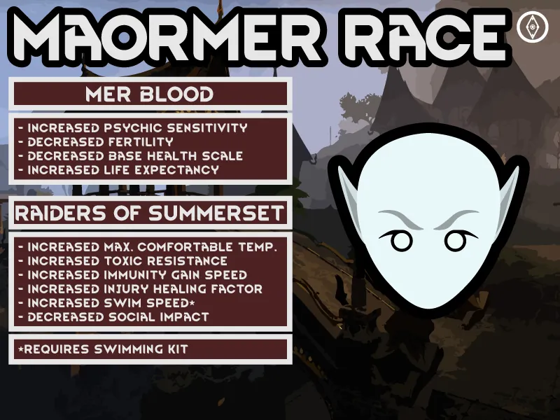 Adds in the Maormer race using Humanoid Alien Race Framework, as well as three factions. Do note that this mod assumes that you own all of the expansions, but should work fine without any. You may notice some stats changes not taking affect if you don't own certain expansions.