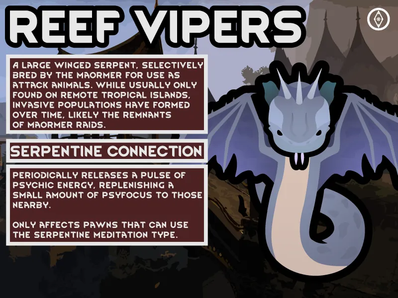 [*] Tame reef vipers periodically releases a pulse of psychic energy, replenishing a small amount of psyfocus for anyone nearby. This only affects pawns that can use the Serpentine meditation type.