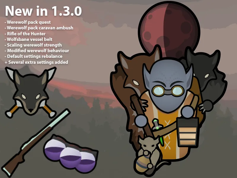 This mod also adds in a new storyteller, Hircine, lord of the hunt. Hircine wants you to prove yourself a worthy hunter, he will isolate you from all allies, no one will aid you in times of need. Trade caravans are significantly less common, whilst minor threats are more common. The bloodmoon will occur on a consistent cycle. You will also be forced to deal with all of this with a halved population limit.
