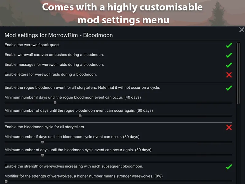 [*] Bloodmoons will not occur for other storytellers by default, this can be changed in the mod settings menu.