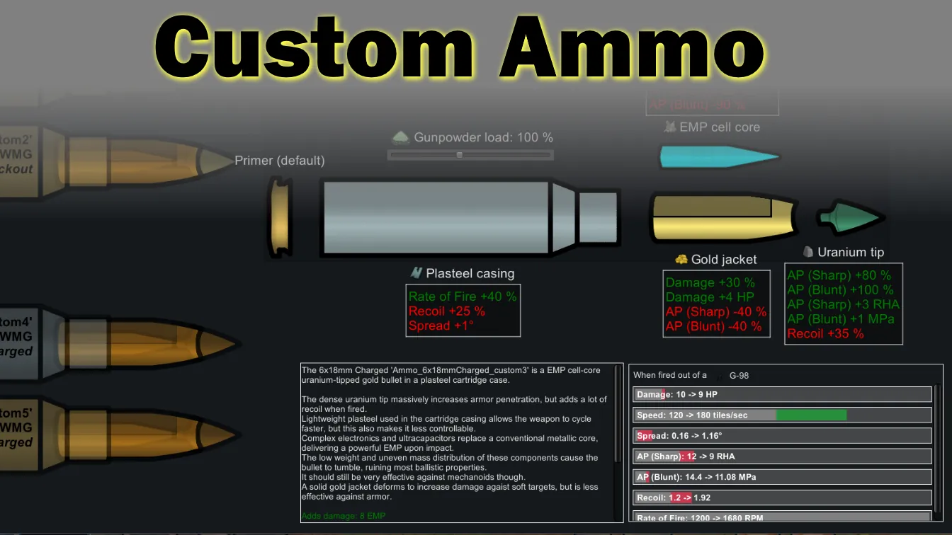 In order to create custom ammunition, you will need to either use the gizmo on the ammo loading tab or use the mod settings. As of right now, this mod only includes ammunition that has a FMJ variant that can be made. ie; no shotgun, charged, larger autocannon, or explosive ammunition.