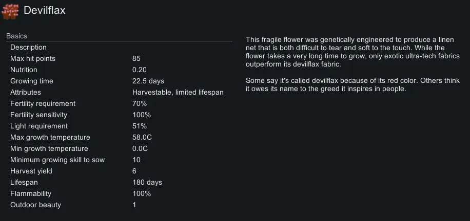 Devilflax texture is from Textiles+, taken with permission by the guy maintaining it: [url=https://steamcommunity.com/sharedfiles/filedetails/?id=2095650910]https://steamcommunity.com/sharedfiles/filedetails/?id=2095650910[/url]