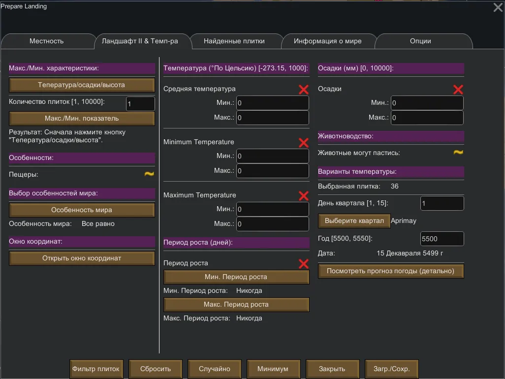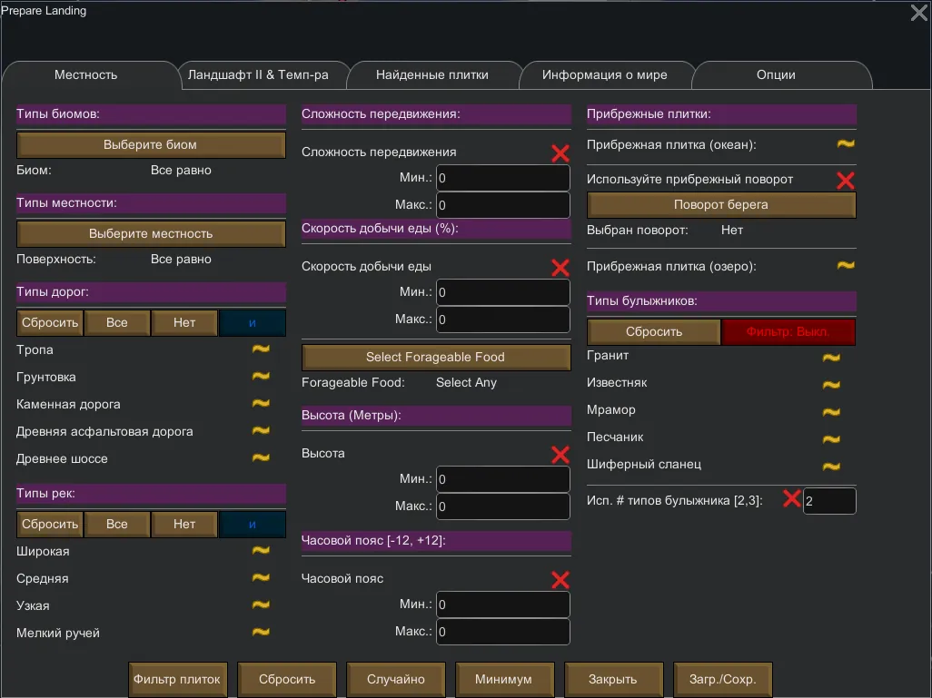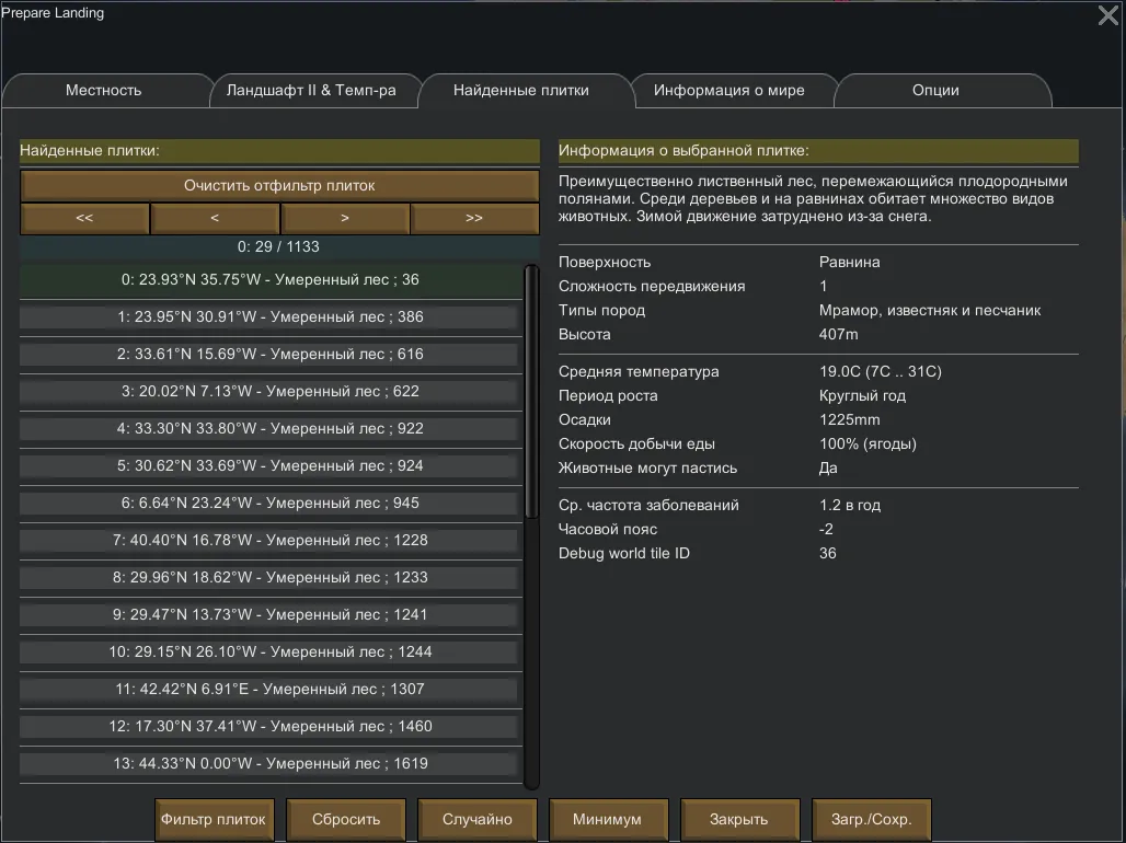 Задайте параметры (к примеру: умеренный лес, широкая река, грунтовая дорога из ресурсов мрамор, известняк и ягоды), после поиска совпадений мод предоставит подходящие плитки на карте.