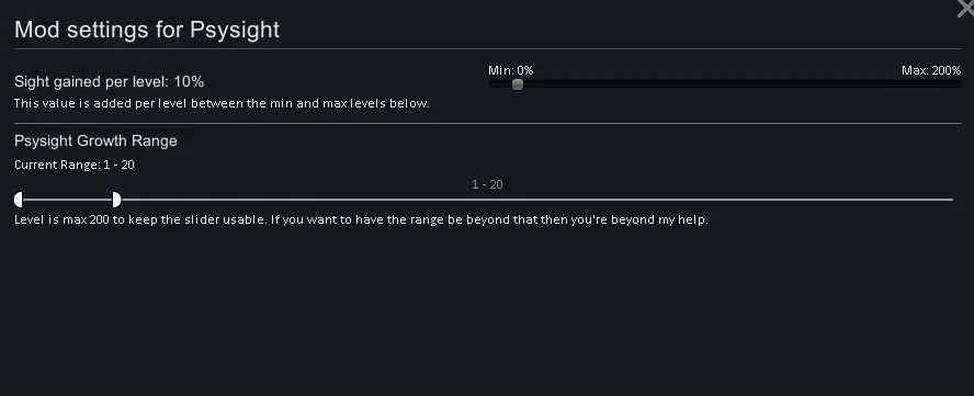 By default the range is levels 1-20, adding a 10% buff to sight for every level (reaching a total of 200% at level 20 for those that failed Maths). If you are using this without VPE, you will need to alter the settings to better fit the level cap your game has instead, vanilla I believe is 6 typically, but for all I know there could be other mods increasing the cap.
