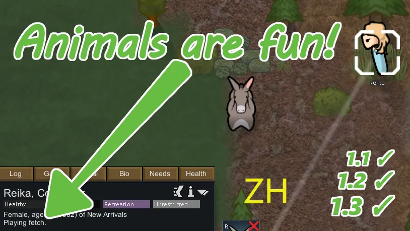Animals are fun: recreational animal interactions的中文機翻漢化,因為懶所以只有簡中 mod設置因為沒有keyed文件所以不知道怎麼搞 大致翻譯: 你希望能和你的小人玩遊戲和散步的動物擁有的 最小意識 最小移速 最大體型 最大野性 是否只和可愛的動物玩(?) 不知道甚麼叫可愛,目前測試中熊不是可愛動物,哈士奇是