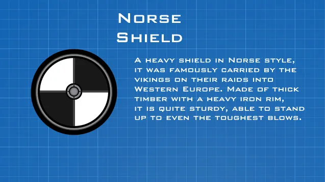 Description: A heavy shield in Norse style, it was famously carried by the vikings on their raids into Western Europe. Designed to protect the user in hand-to-hand combat and against projectiles. Made of thick timber with a heavy iron rim, it is quite sturdy.