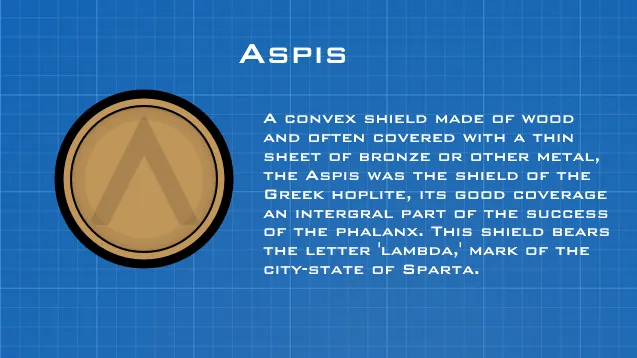Description: A convex shield made of wood and often covered with a thin sheet of bronze or other metal, the Asis was the shield of the Greek hoplite, and its good coverage was an integral part of the success of phalanx. This shield bears the letter 'lambda,' mark of the city-state of Sparta.