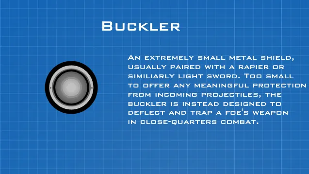 Description: An extremely small metal shield, usually paired with a rapier or similiarly light sword. Too small to offer any meaningful protection from incoming projectiles, the buckler is instead designed to deflect and trap a foe's weaopon in close-quarters combat.