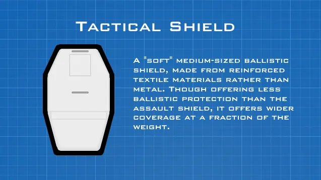 Description: An advanced composite shield with a suite of integrated sensors, the assault shield was designed for military units likely to find themselves engaged in extremely close-quarters combat. Far smaller than a full-sized ballistic shield, it trades coverage for mobility. Though capable of stopping handgun and rifle rounds, its small size leaves the user very little to hide behind should they find themselves under sustained fire.