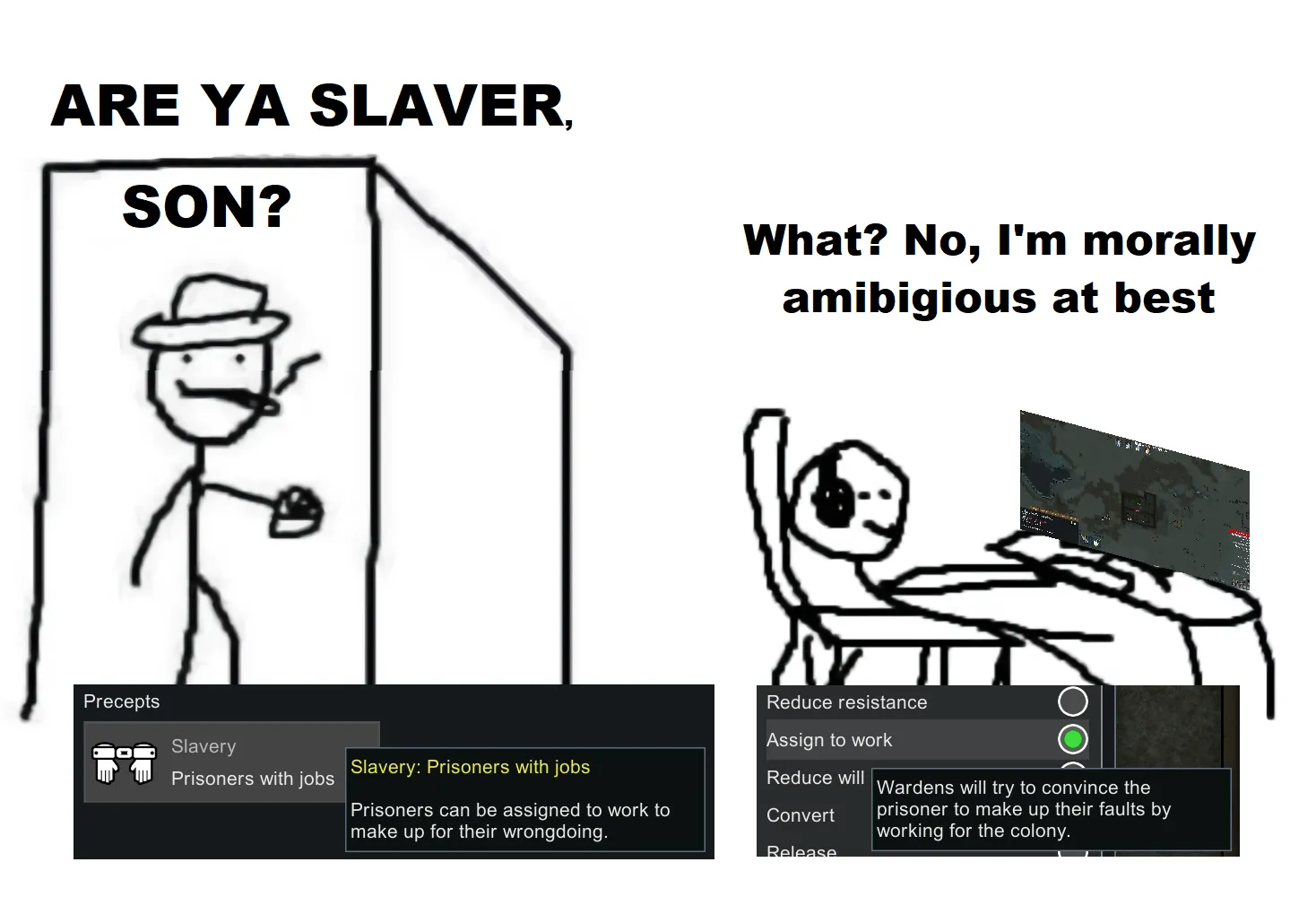 This mod is an answer to [url=https://www.reddit.com/r/RimWorld/comments/w2lsum/how_can_i_tell_my_family_that_the_prisoners_in_my/]this reddit post[/url]. If a family member or other accidental viewer bothers you again about so-called slavery, just show them the precept.