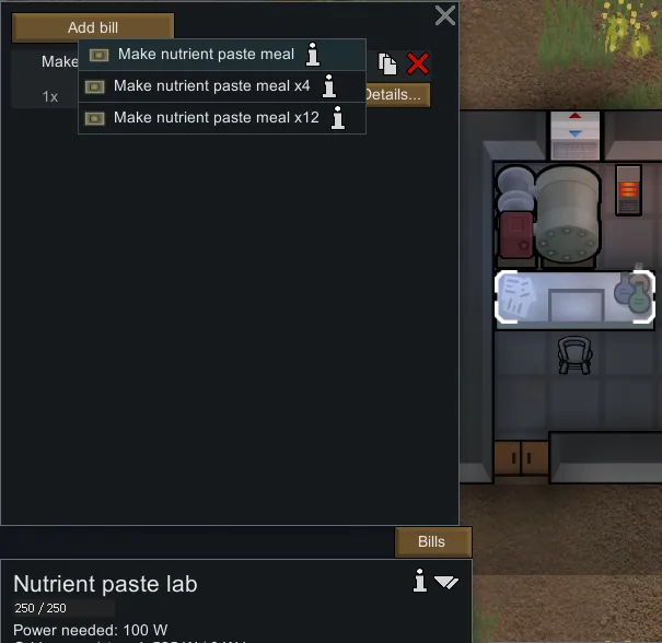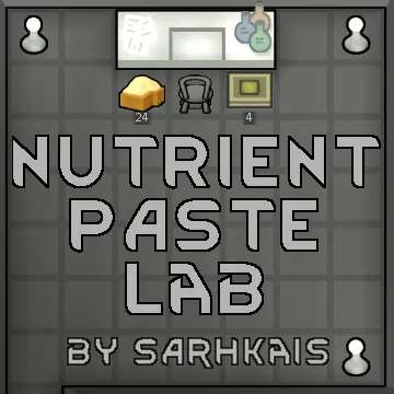 Adds a simple 'Nutrient Paste Lab' building for bill creation of Nutrient Paste. Nutrient cost ratio is identical to vanilla's paste dispenser. Can make singles, or in sets of four or twelve. Requires a cook and a little skill, (3, 5 and 7 skill for 1, 4 or 12 meals respectively) particularly to make larger batches.