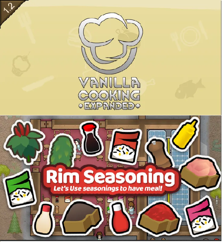 This mod more fully integrates RimSeasoning and Vanilla Cooking Expanded. There is now only one type of ketchup, mayo, salt and red pepper. The VCE textures are used. Hot Sauce is now a RimSeasoning condiment with associated trait and thought. Vanilla cooking spices can now be used in the RimSeasoning mill or as a gourmet ingredient. Salt can be either drilled (VCE) or mined (RimSeasoning). If Salted Meat is also being used, there will be only one type of mineable salt rock.