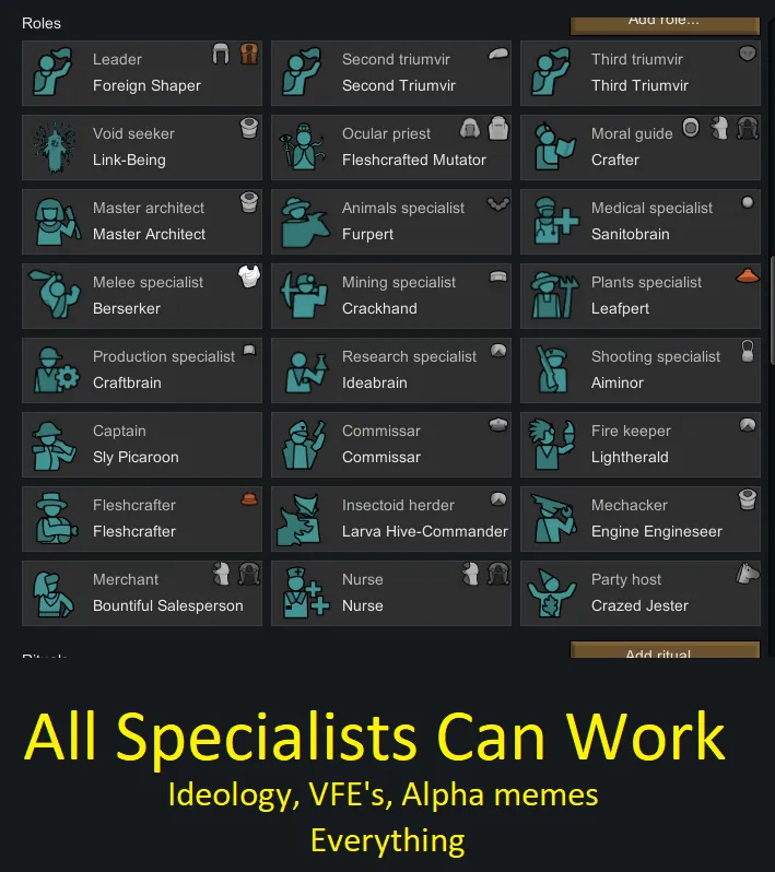 Now every single Specialist can work. Works with [url=https://store.steampowered.com/app/1392840/RimWorld__Ideology/] Ideology[/url], works with all [url=https://steamcommunity.com/workshop/filedetails/?id=1884025115] VFE's[/url], works with [url=https://steamcommunity.com/sharedfiles/filedetails/?id=2661356814] alpha memes[/url].