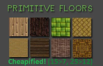 This mod reduces the cost of floors from Primitive Floors or Primitive Floors (Continued). Wooden floors are reduced from 15 wood to 7 wood to be in-line with metal tiles and carpets, and hay floors are reduced from 25 to 12. The absurd gold cost of Tiki Floor (Fancy) has also been reduced from 60 to 10, bringing it more in-line with the cost:beauty ratio of gold tiles.