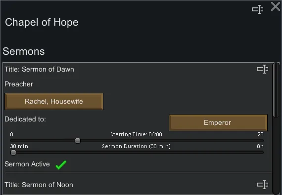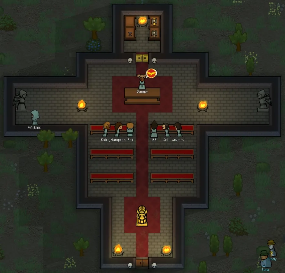 The mod adds various buildings to enhance your colony with places of worship. You may build altars to hold sermons from. These are social gatherings where your colonists get together to pray and increase favour with a god.