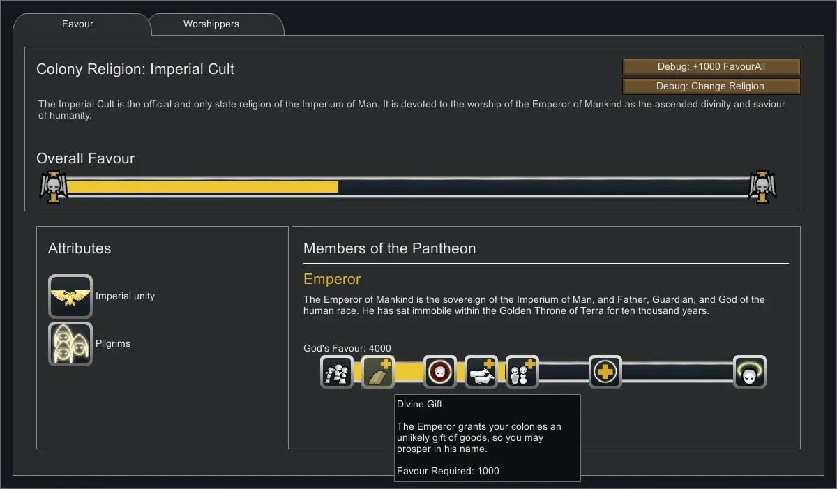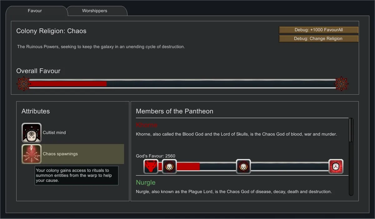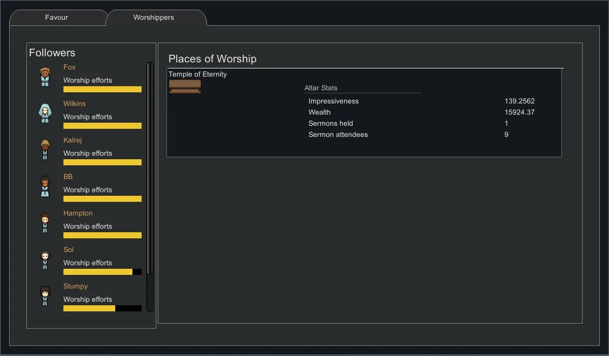 The base mod has colonists track their individual favour with various deities. This module adds more meaning to those stats, as individual favours contribute to a global pool.