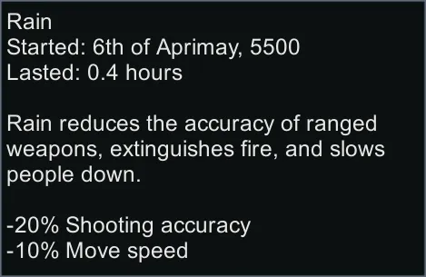 Adds how long a weather effect has been active to its tooltip, in the same format as for events like volcanic winter. Also adds information of the exact penalties of the weather effect.