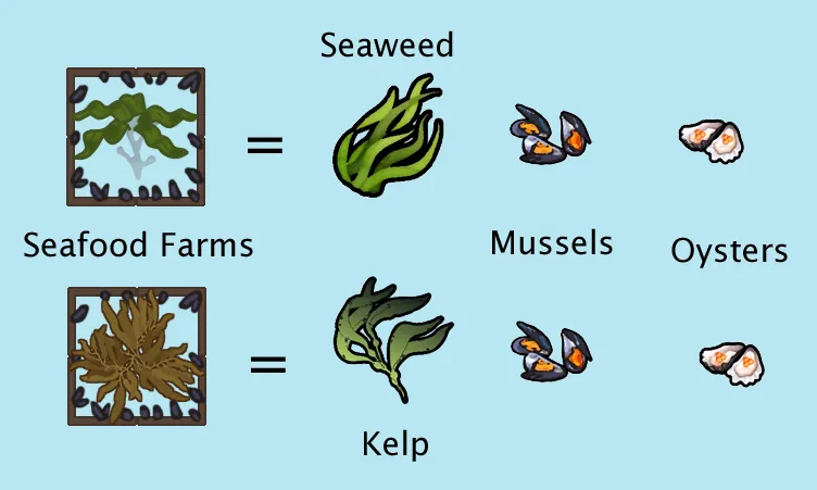 Adds vertical ocean farms that spawn Kelp, Seaweed, Mussels and Oysters over time.