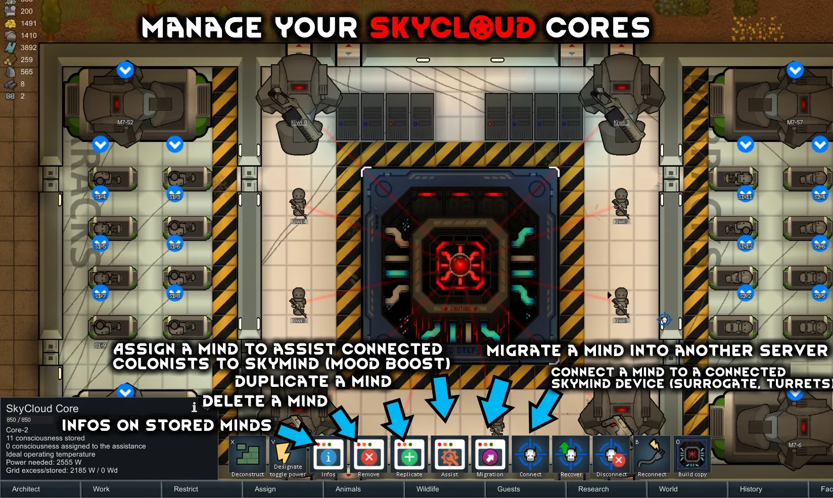 [*] Transform your colony into a robotic hive (yes like mechanoids), by digitize all your colonists into a SkyCloud Core (or several for more security)
