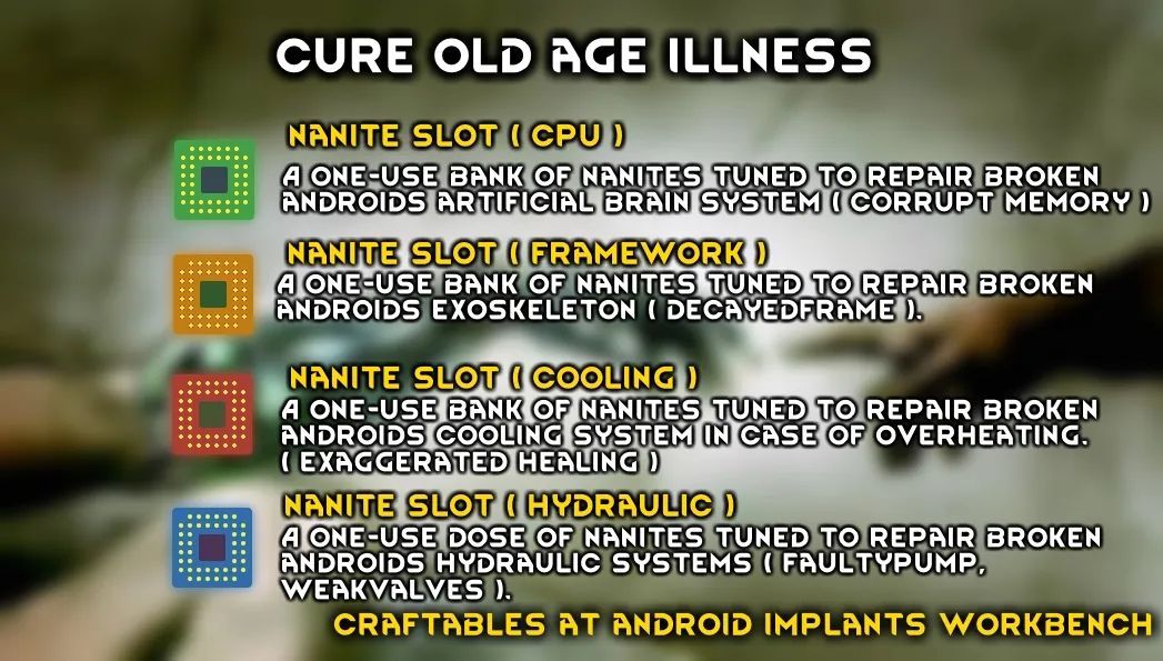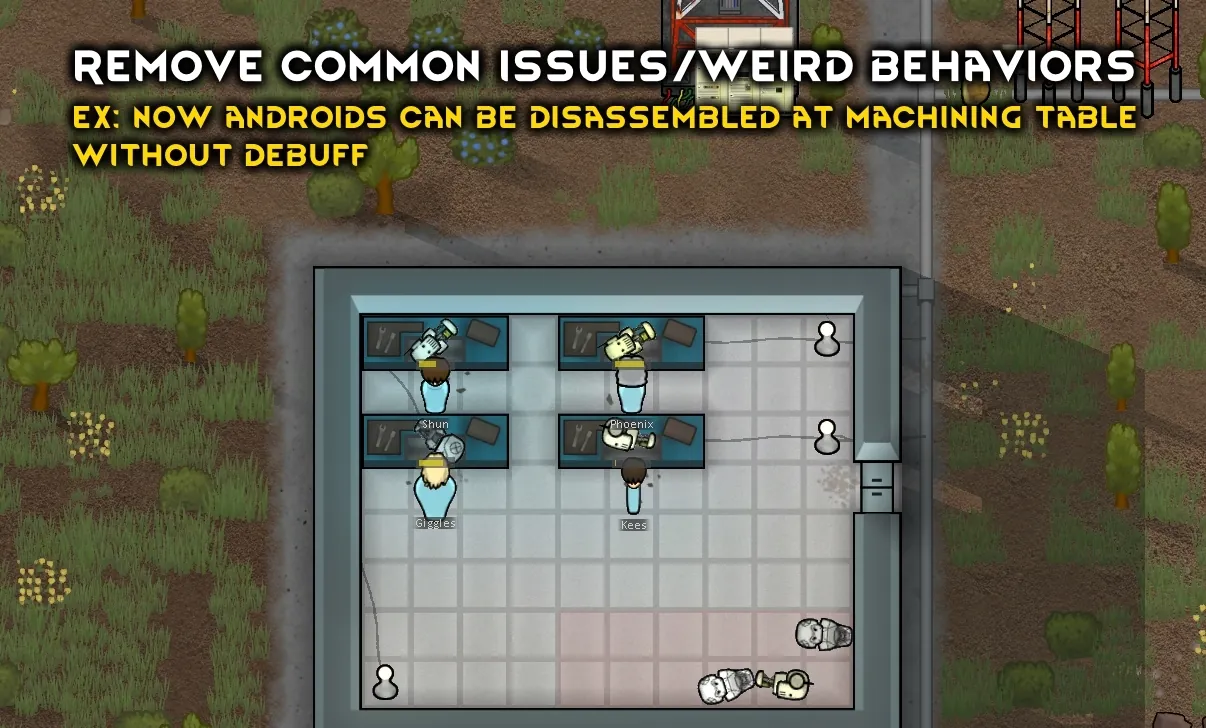 [*] Remove/Fix common issues/weird behaviors (butchering androids debuff, eatable android corpses, disassemble androids at machining bench, androids anxiety, unrepairable aging androids, ... )