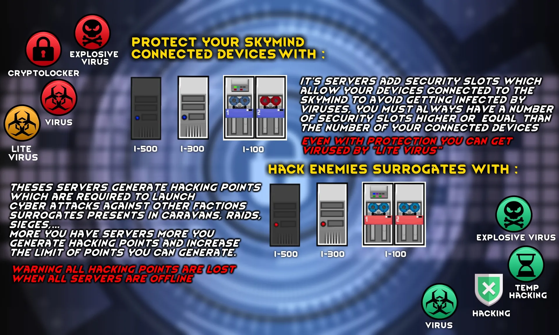 SkyMind is a wireless network allowing mind uploads/downloads (androids upgrade, colonists (with a VX1/VX2/VX3 neural chip) mind duplication/permutation) and remotely control surrogate androids (a new serie of regular androids with their artificial brains replaced by an advanced remote control system).