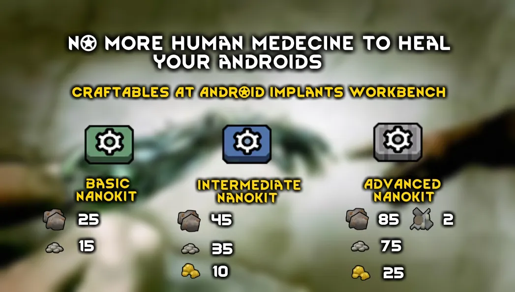 [*] Allow healing androids with nanokits (instead of medicine stuff), and by blacksmiths instead of doctors