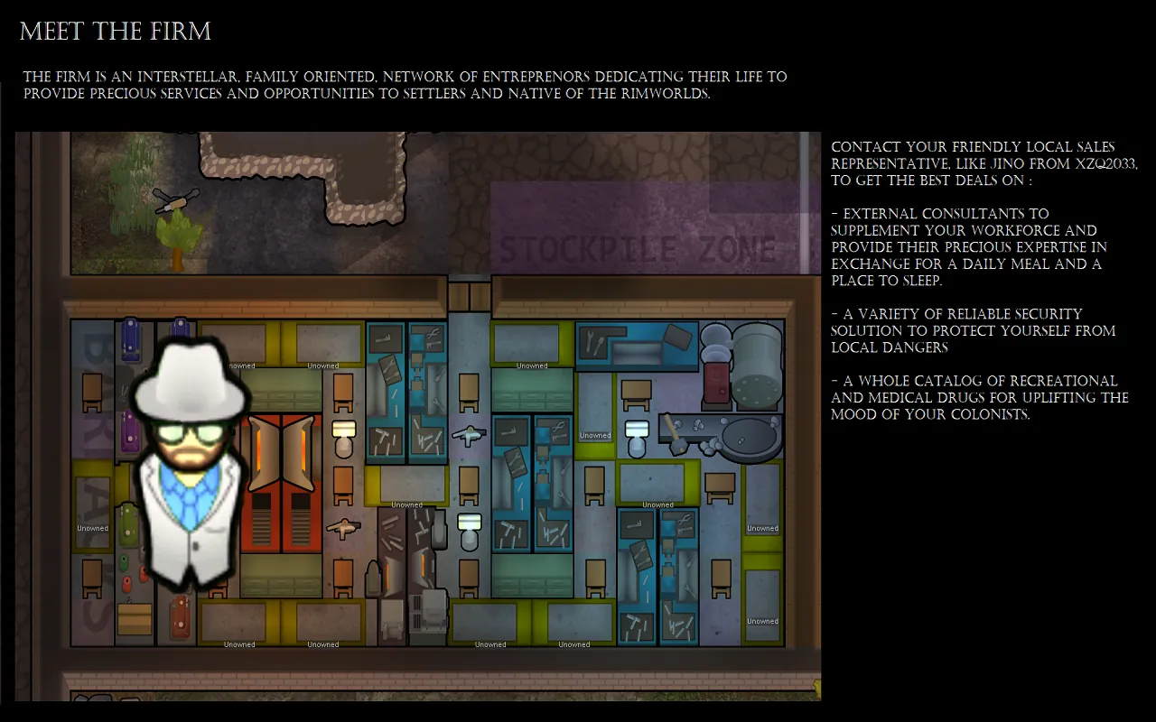 The Firm is a interplanetary conglomerate of free minded entrepreneurs ready to take the risks inherent to setting their sight on lawless Rimworlds in the hope of earning matching profits.