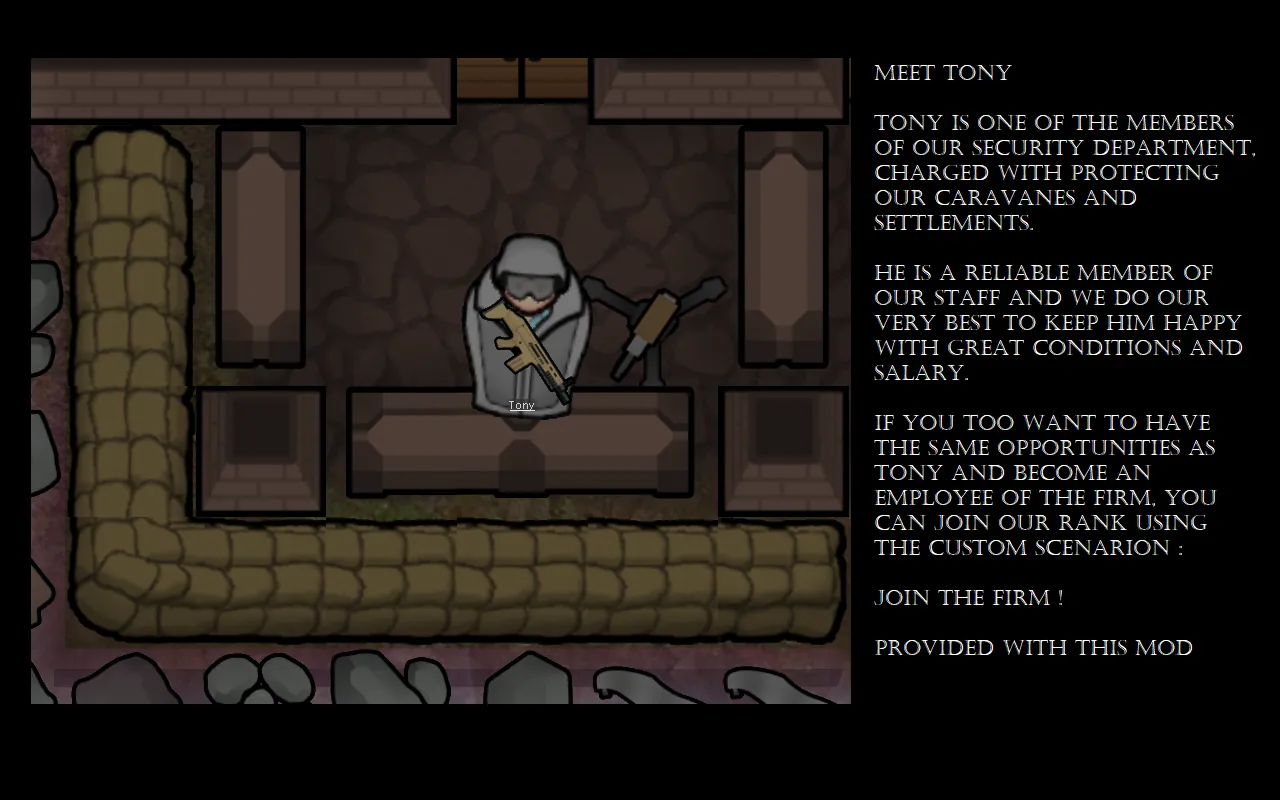 The Firm now include pawns from the Vanilla Races Expanded : [url=https://steamcommunity.com/sharedfiles/filedetails/?id=2995385834]Highmate[/url], [url=https://steamcommunity.com/sharedfiles/filedetails/?id=2983471725]Waster[/url], [url=https://steamcommunity.com/sharedfiles/filedetails/?id=2975771801]Android[/url], [url=https://steamcommunity.com/sharedfiles/filedetails/?id=2901424072]Genie[/url], [url=https://steamcommunity.com/sharedfiles/filedetails/?id=2893586390]Hussar[/url] & [url=https://steamcommunity.com/sharedfiles/filedetails/?id=2880990495]Saurid[/url]