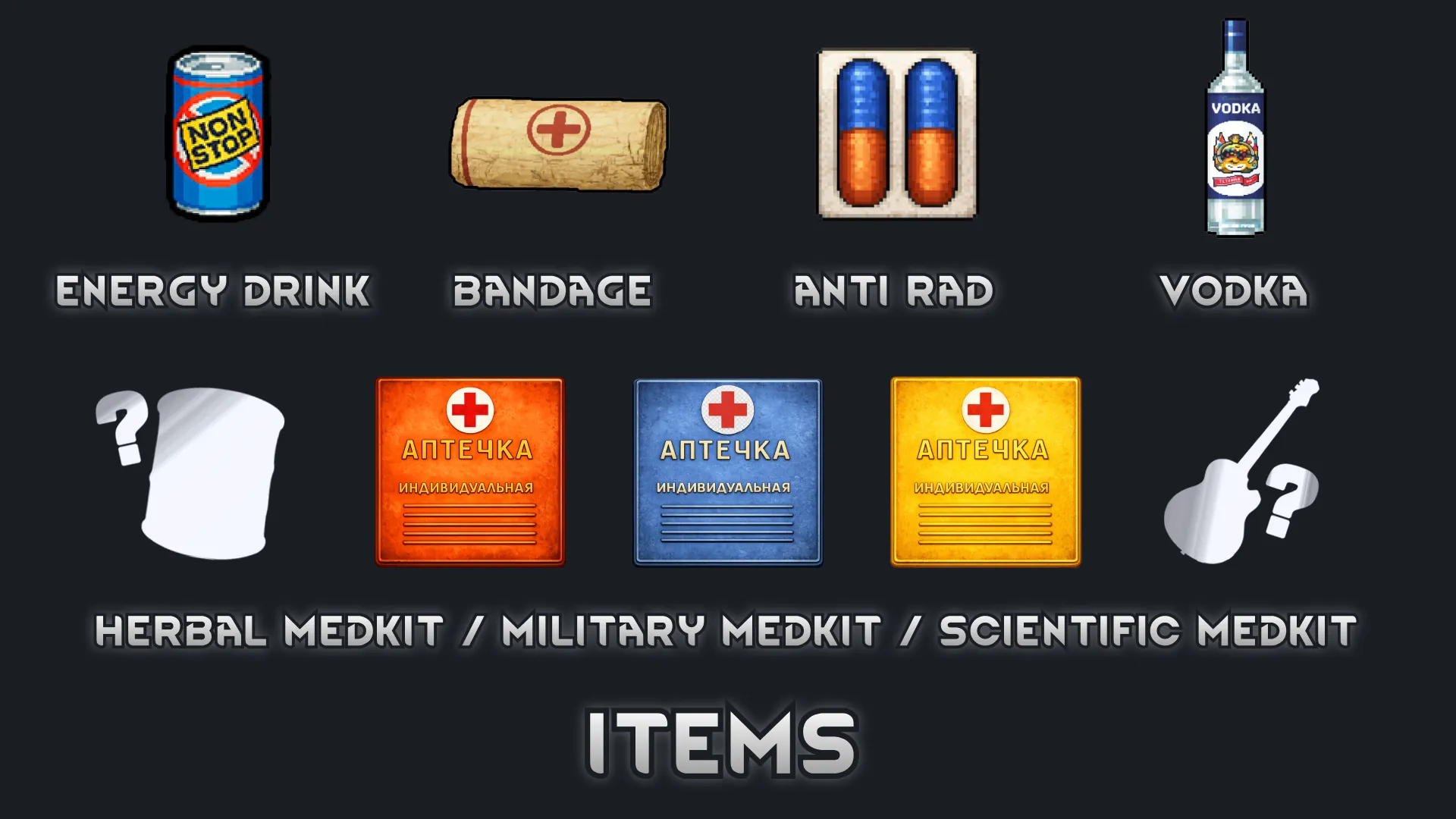 [*] [b]Anti-radiation medicine[/b] — items and drugs that help deal with irradiation (including Antiradin; medkits can now reduce radiation too).