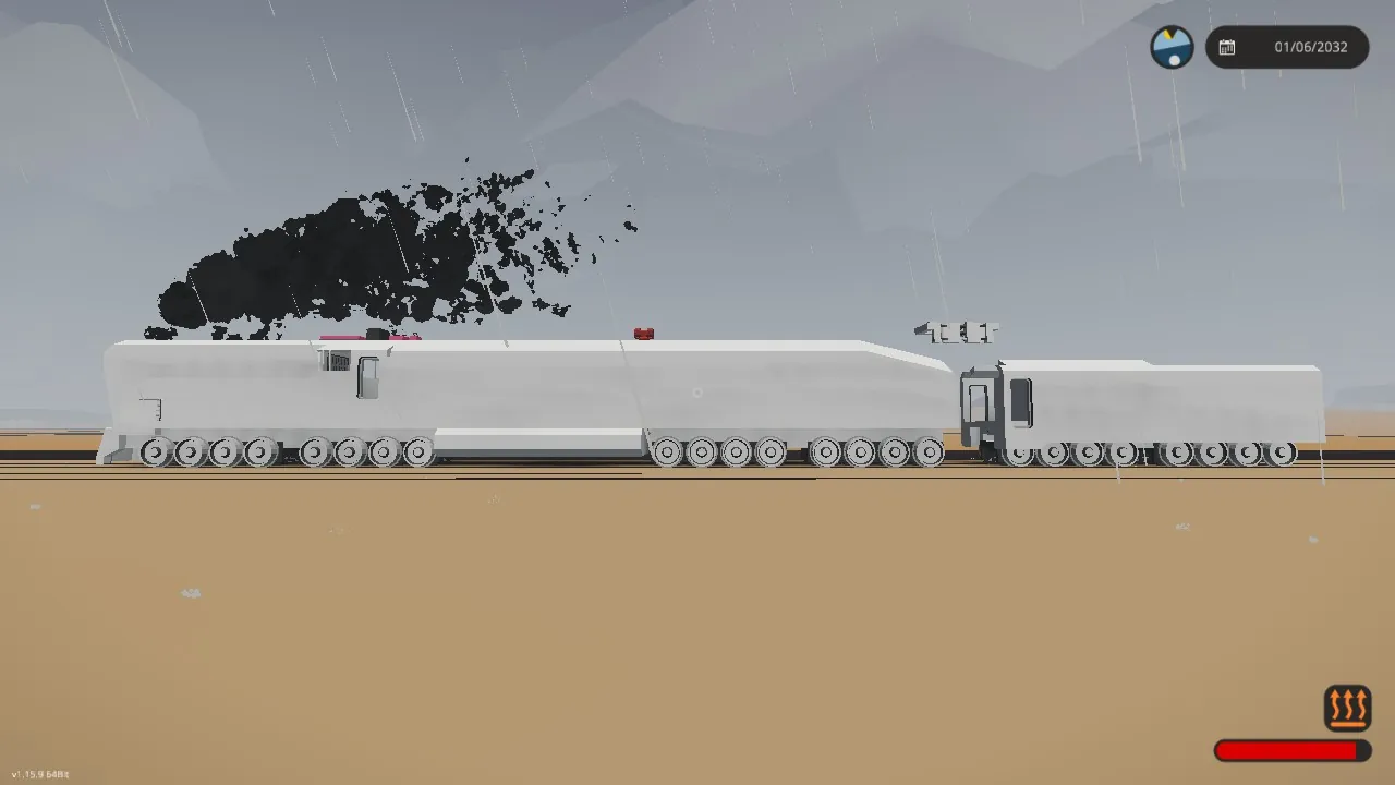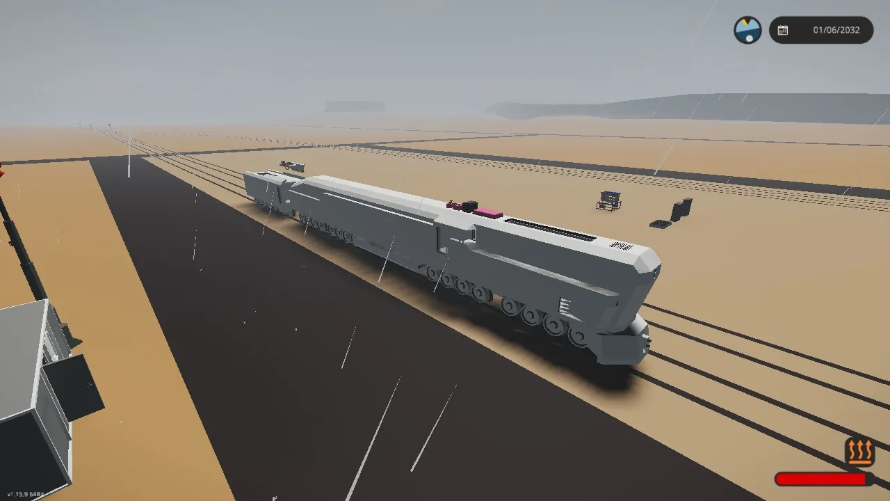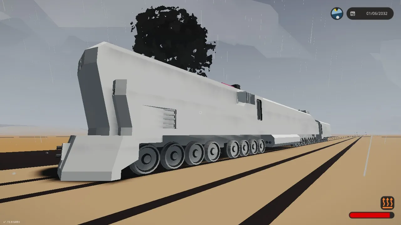 The locomotive uses an experimental 8x8 + Sub-tank + 8x8 configuration. The bogies take design inspiration from the workshop's most popular Big Boy, though they are not offset; instead, the design uses a centered pivot between the two 8-wheel sets. The front wheel set features an M1-style cow plow, modified to house a static coupler arrangement mounted directly to the plow rather than the main body.