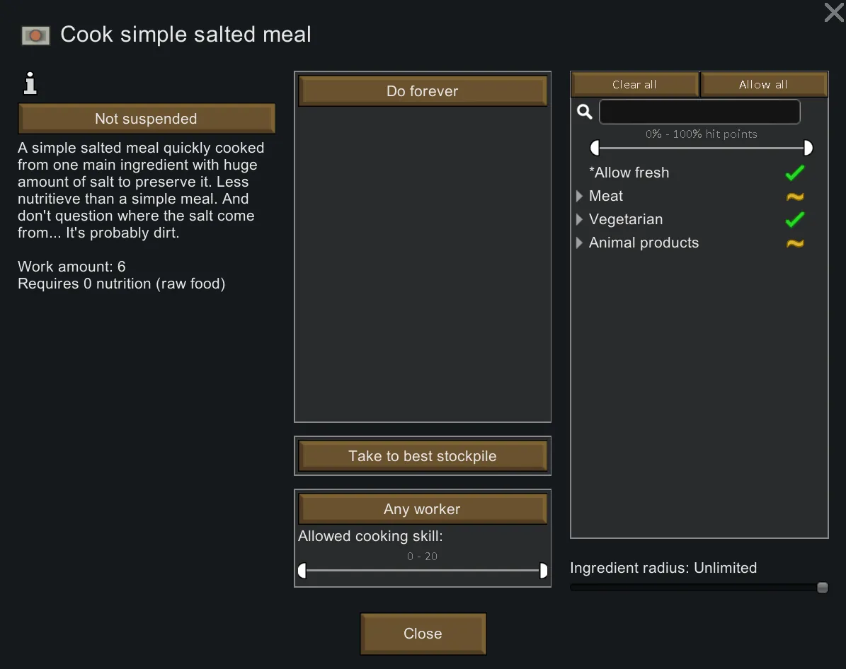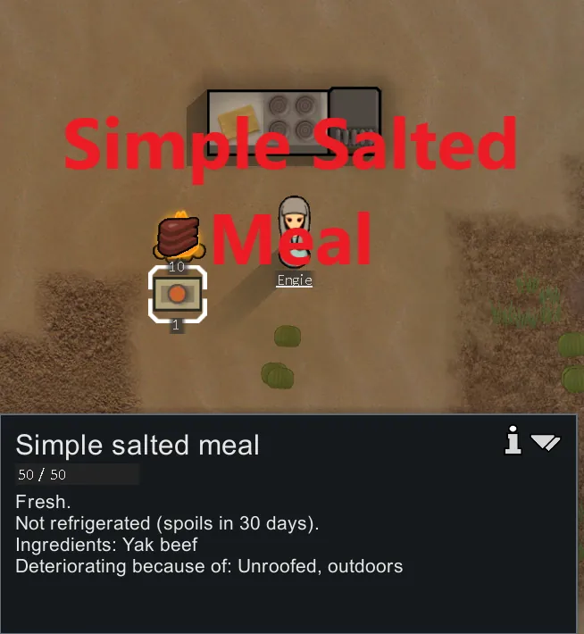 Cooked food like simple meal that doesn't expire after two days with a small nutrition malus. Expire after fifty days. Designed for getting rid of food issues when using medieval mods or in gameplays with the incapacity of storing food properly.