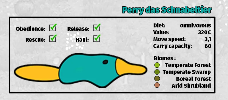 "Eine Rimworld ohne Perry ist zwar denkbar, aber sinnlos." Ein einfaches türkises Schnabeltier. Es ist wie andere Schnabeltiere auch, es macht nicht viel. [img]https://i.imgur.com/fK9UkVh.jpeg[/img]