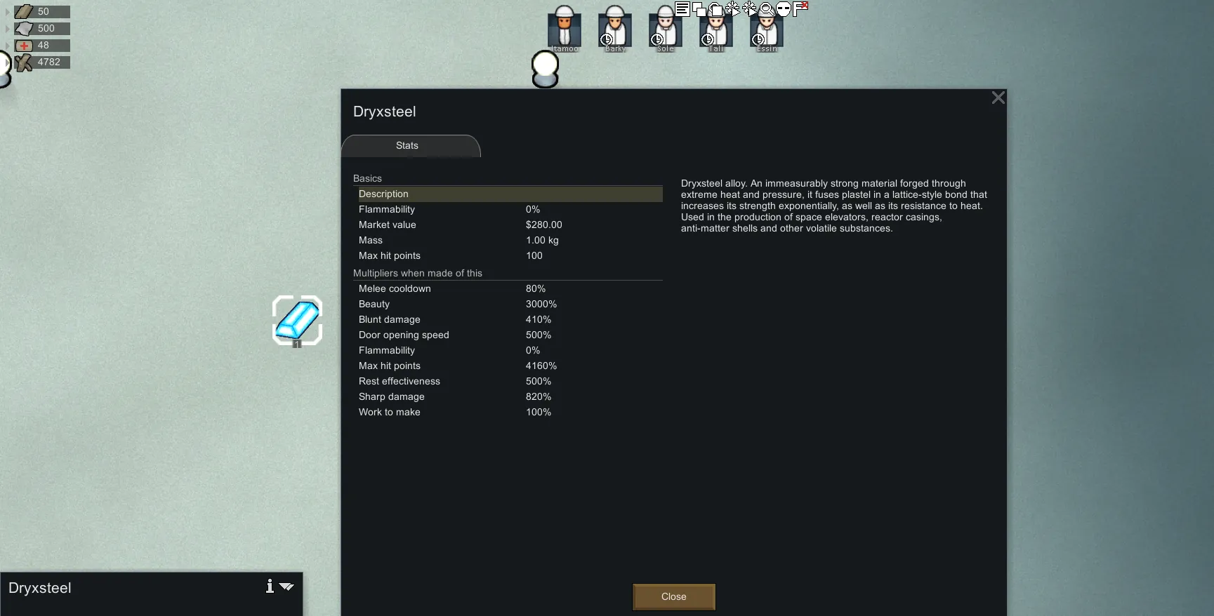 I've made it craftable at an Electric Smelter for 20 plasteel per Dryxsteel. Dryxsteel is just 20x Plasteel's health, 8x it's melee damage. Door opening speed is instant, beauty is.. Very high. As I said it's a testing material not meant for actual gameplay as it's just incredibly strong.