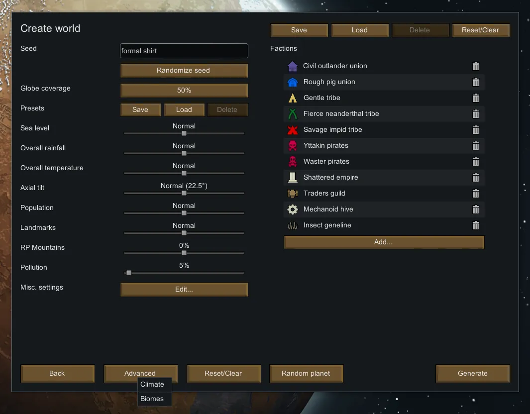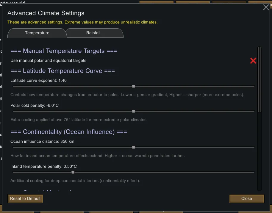- Expanded world creation controls: sea level, rainfall, temperature, axial tilt, hilliness bias, presets, randomization tools, and Advanced Climate settings.