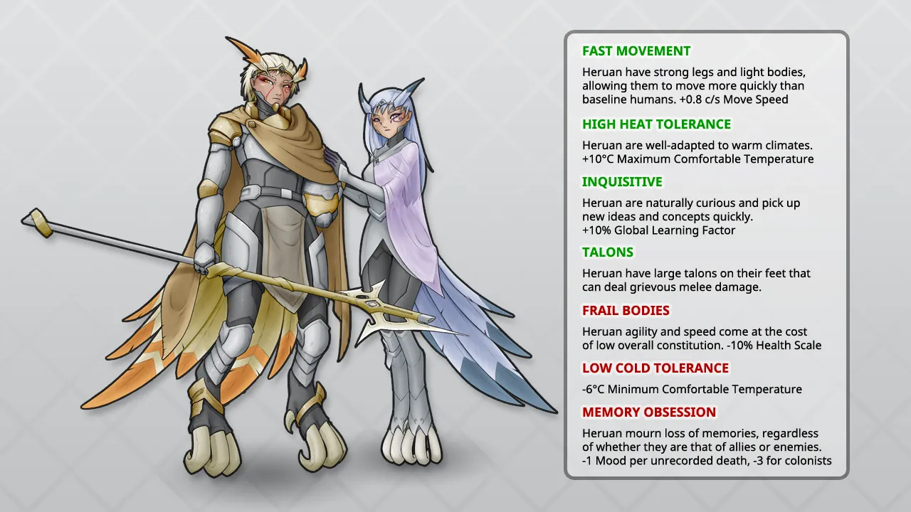 This mod adds the heruan, a vanilla-friendly race of avian xenohumans hailing from a long-forgotten glitterworld!