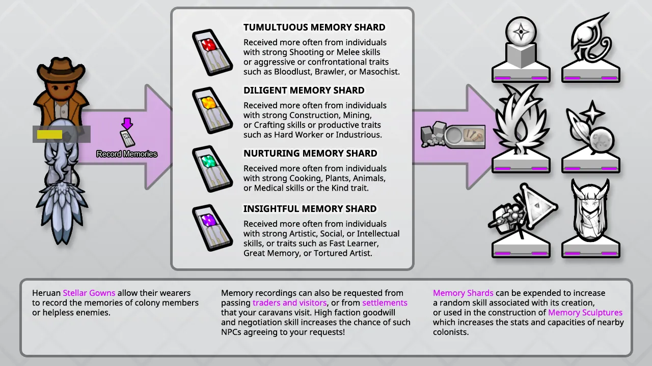 Memory shards come in four types: Tumultuous, Diligent, Nurturing, and Insightful. They can be expended to gain a significant amount of experience in a random skill associated with its creation, or used in the construction of memory sculptures.