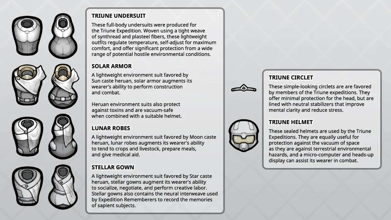 The growers, handlers, and caregivers of heruan society, Moon caste heruan grow and raise food and provide healthcare and medical services for the Triune Expeditions. Lunar robes enhance their ability to perform these tasks.
