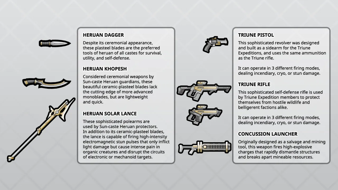 [*] [b]2 melee weapons, 3 ranged weapons, and the Solar Lance, a hybrid polearm with a built-in stun pulse launcher.[/b]