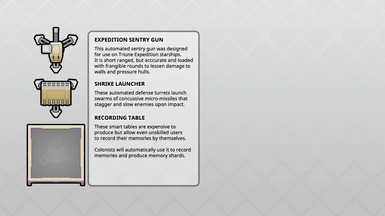 [*] [b]Memory Obsession[/b] - Heruan are obsessed with the recording and keeping of memories, and will be saddened by the loss of unrecorded life. They gain a stacking -1 mood penalty when any sapient individual dies in the same area, regardless of whether they were enemy or ally. This penalty increases to -3 for friendly colonists.