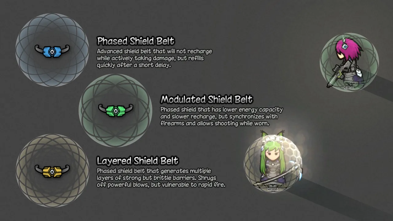 [b]Phased Shield Belt[/b] - An advanced shield belt with increased shield capacity. It can take more damage at one time before collapsing, but it cannot recharge for several seconds after taking damage. It also recovers significantly faster after being broken.