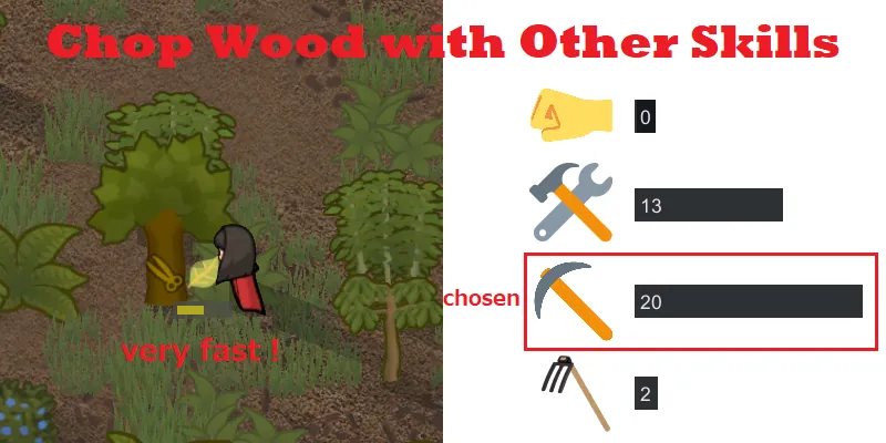 This mod will change the speed of chopping wood so that it can be replaced not only with plants skills but also with melee, construction, and mining skills, and the workers will use their best skills at chopping wood.