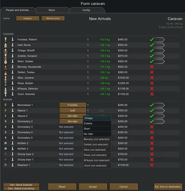 Ever felt that traveling through the world map is just too slow? With this mod, you can get to your destination on the world map more quickly using the animals you have trained. In the form caravan dialog, you can select for each animal what colonist should ride it. This improves caravan movement speed in different ways. First, the animal's movement speed is used instead of the colonist's when the caravan map speed is calculated. Moreover, if every colonist is riding an animal, a large movement bonus is applied (configurable in the mod options). If not, a small movement bonus is applied, that depends on the ratio between riding pawns and not-riding pawns, and a maximum value that can be set in the mod options. [b]There is one downside to riding animals in a caravan though: the carrying capacity of the animal is decreased by the weight of the pawn that rides it[/b].