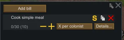 - "X per colonist" : Set X to "4" to keep 4 meals per colonist.