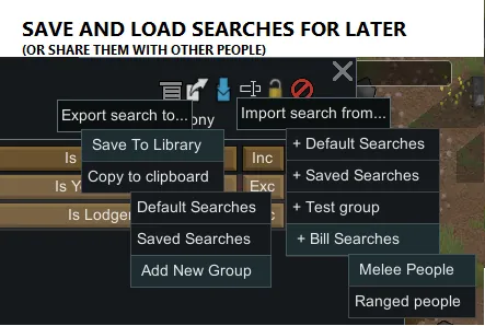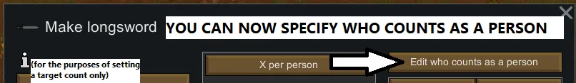 [b]Highly-customizable target counts[/b] thanks to the TD Find Lib. You can edit who counts as a person: Check out the preview images. e.g. you can not only set a bill to craft tribalwear for slaves only, you can set the bill to craft weapons only for your people with the appropriate skill!
