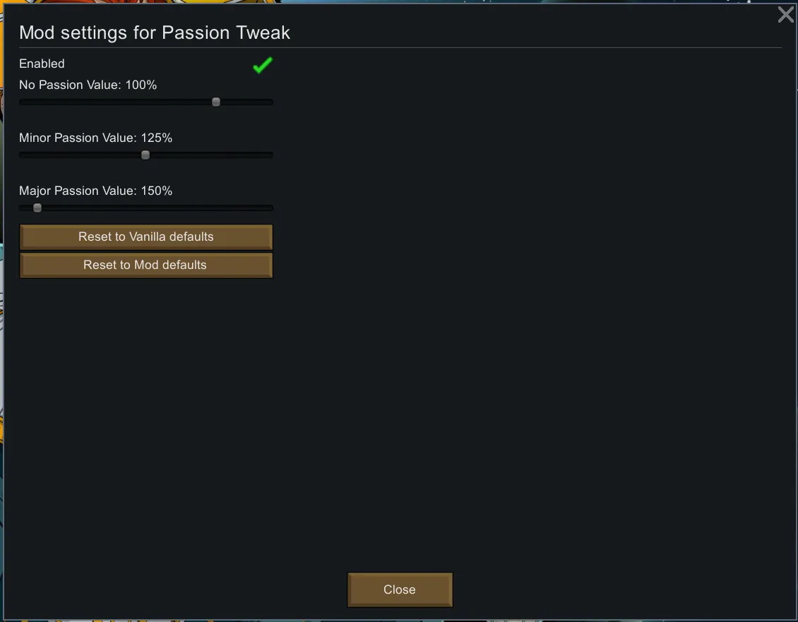 Allows you to tweak the learning rate of each passion level (no, minor, and major). RimWorld default is: 0.35, 1.00, 1.50. This mod's default is: 1.00, 1.25, 1.50.