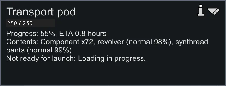 In the detail box for a transport pod that is in the progress of being loaded, shows the overall progress of the pod group and an estimate of how long time remains. The ETA is only shown after a few items have been loaded.